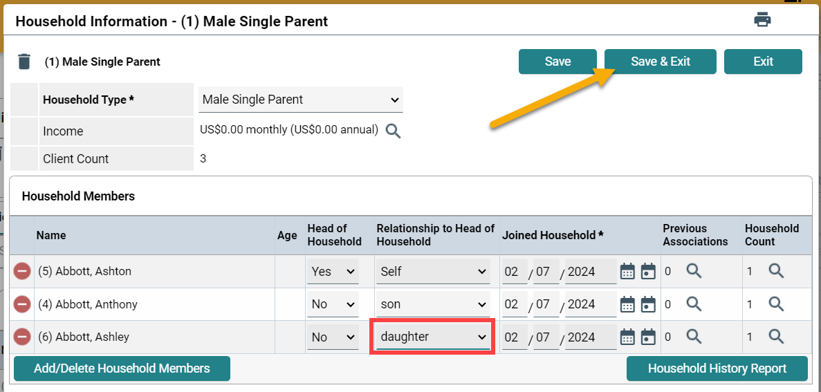 b. Update the newly-added clients' Relationship to Head of Household, and click Save & Exit.