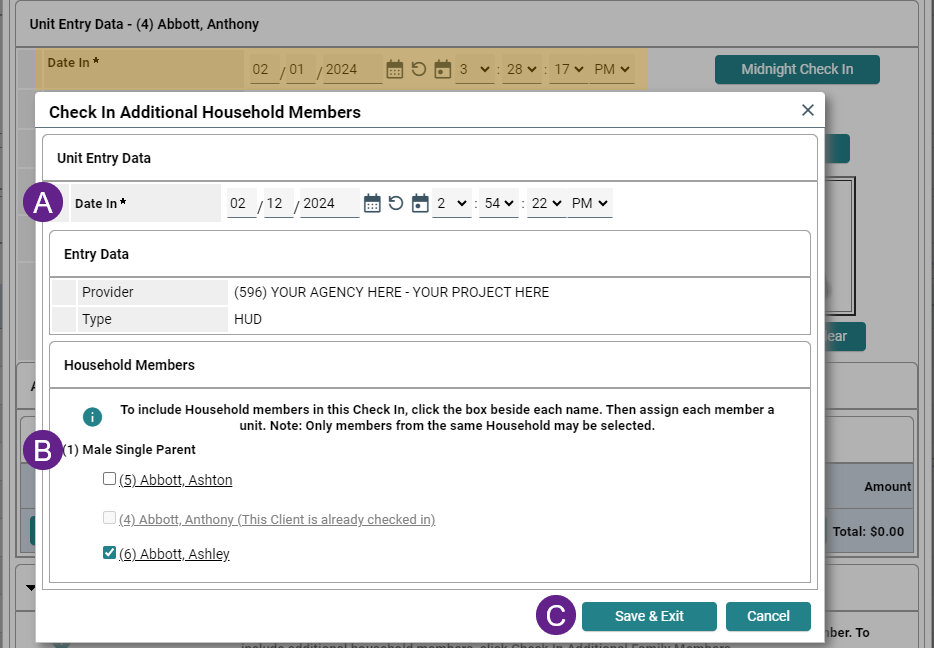 NOTE: If the household member(s) entered the project at the same time as the Head of Household, the Date In must be identical to the Date In for the Head of Household (it is visible on your screen, as highlighted below).