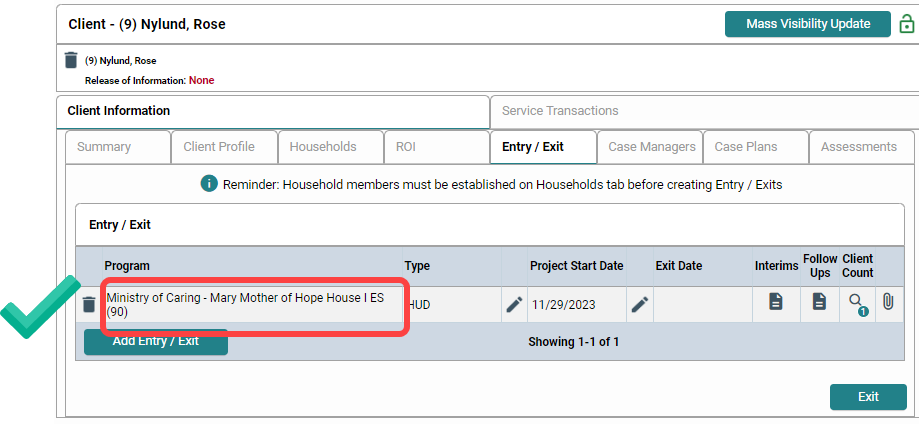 A: Under Program, the Entry / Exit table should show the specific project that the client was enrolled into