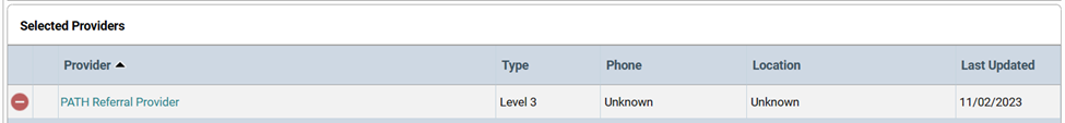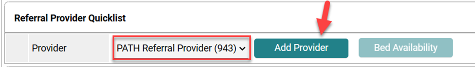 6. Under the Referral Provider Quicklist, click on the drop down and select the only option: “PATH Referral Provider (943)”. Then, click “Add Provider”.